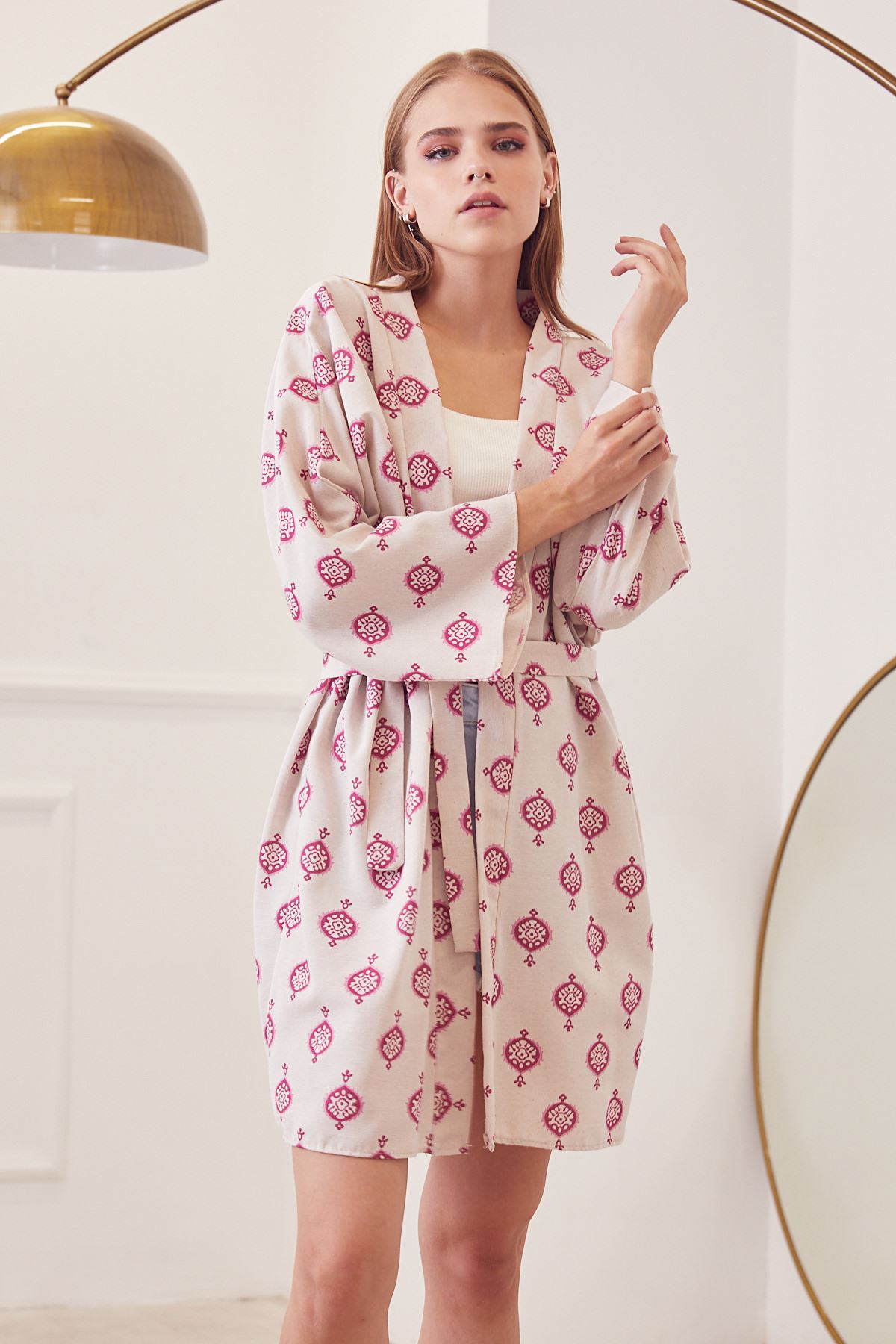 Desenli Kuşak Detay Kimono Ceket-Gül Kurusu