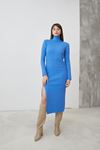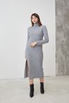 Ürün Özellikleri: Balıkçı yaka, uzun kollu, kendinden fitilli, yırtmaçlı triko elbise.