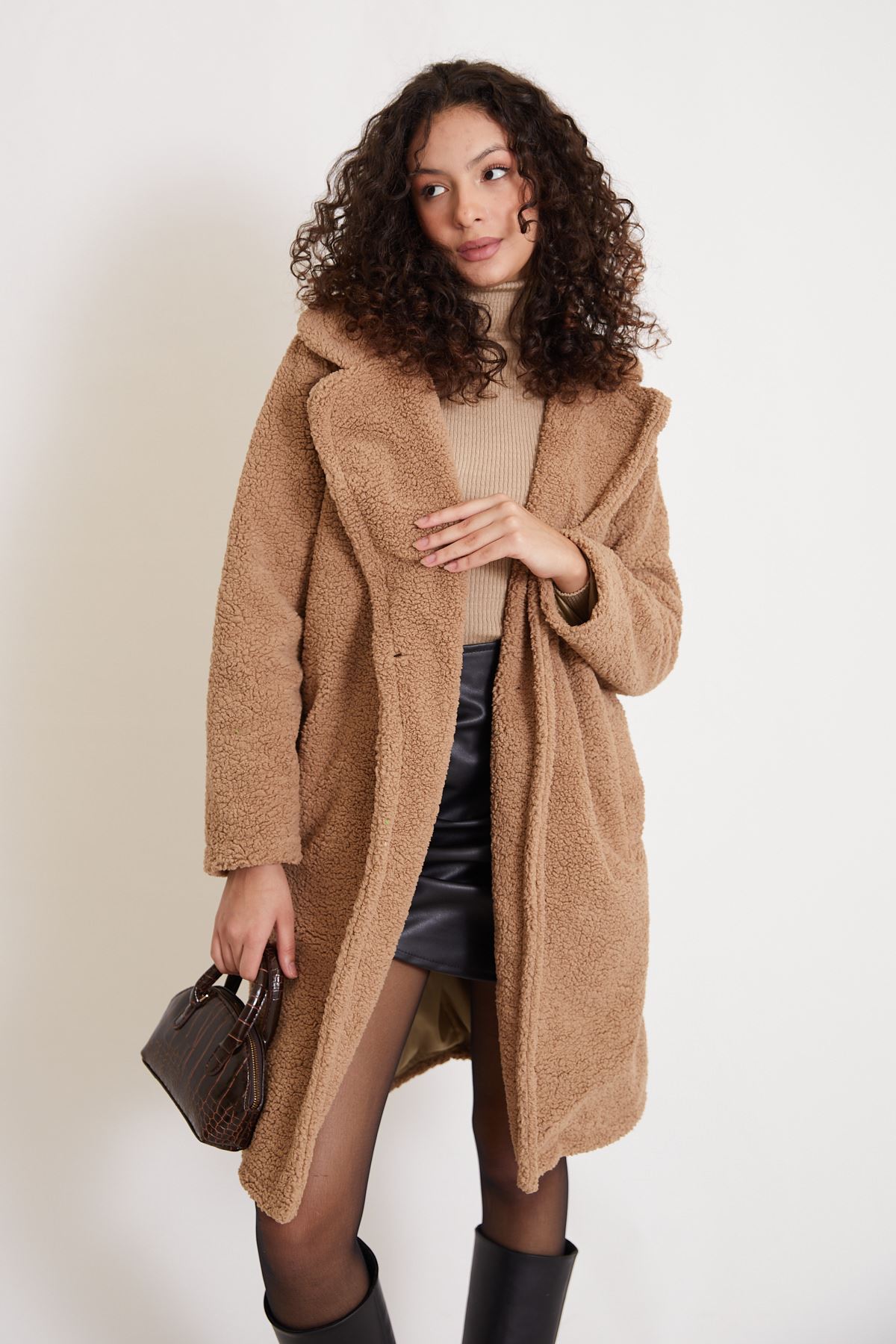 Ürün Özellikleri: Kruvaze yaka, içi astarlı tek düğmeli, yan cepli, peluş kaban.